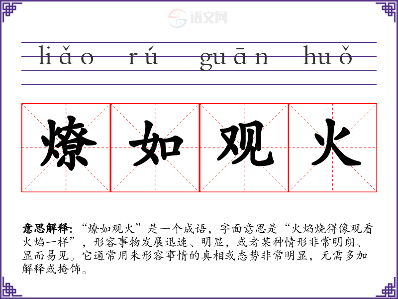 “燎如观火”来源于《左传》,原句为“燎如观火,焚如铄金”。这个成语的历史背景可以追溯到春秋时期,描述了火焰燃烧的强烈和迅速,隐喻事情的发展或变化的显著程度。它强调了事物的明显性和迫切性。