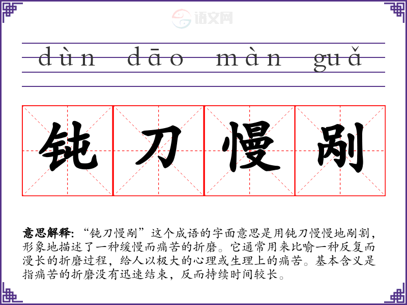 “钝刀慢剐”这个成语的字面意思是用钝刀慢慢地剐割,形象地描述了一种缓慢而痛苦的折磨。它通常用来比喻一种反复而漫长的折磨过程,给人以极大的心理或生理上的痛苦。基本含义是指痛苦的折磨没有迅速结束,反而持续时间较长。