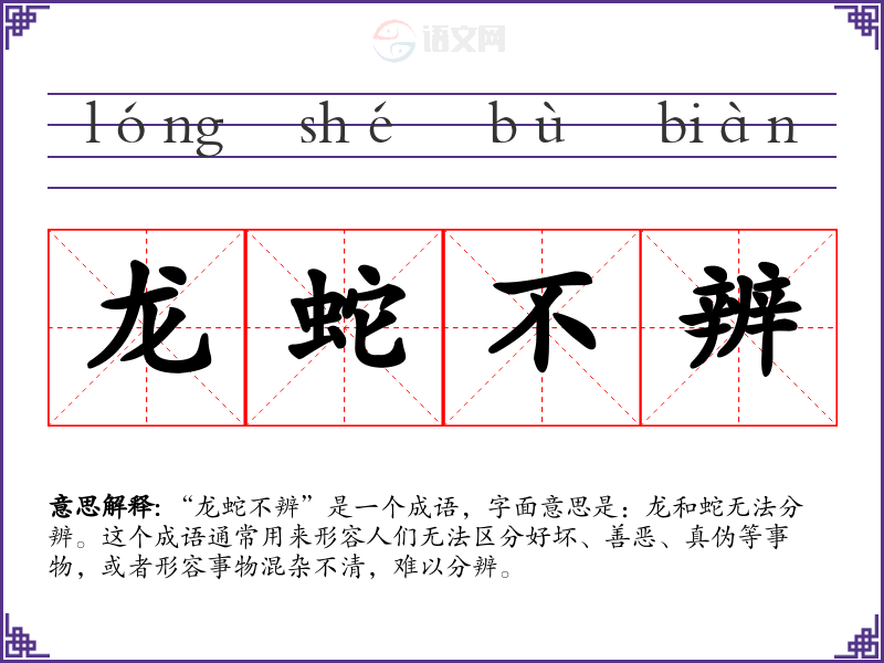 “龙蛇不辨”是一个成语,字面意思是:龙和蛇无法分辨。这个成语通常用来形容人们无法区分好坏、善恶、真伪等事物,或者形容事物混杂不清,难以分辨。