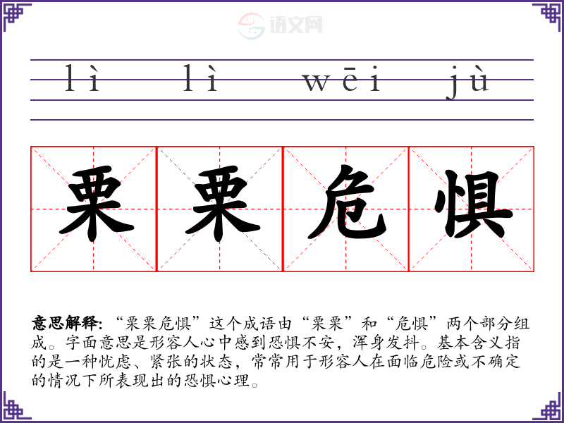 在文学作品中,“栗栗危惧”常用于描绘角色在危机时刻的心理状态,如在小说中描述主人公面临生死抉择时的恐惧。在日常对话中,人们也可以用这个成语来形容自己在某种情况下的紧张感,比如准备考试前的心情或在面试时的状态。在演讲中,这个成语可以用来强调面对挑战时的心理准备。