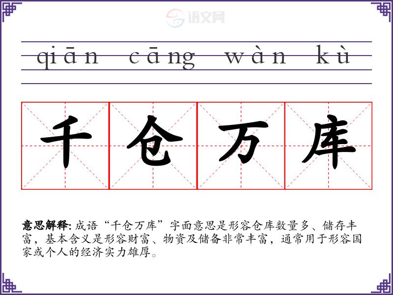 成语“千仓万库”字面意思是形容仓库数量多、储存丰富,基本含义是形容财富、物资及储备非常丰富,通常用于形容国家或个人的经济实力雄厚。