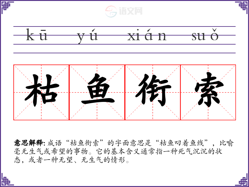 成语“枯鱼衔索”的字面意思是“枯鱼叼着鱼线”,比喻毫无生气或希望的事物。它的基本含义通常指一种死气沉沉的状态,或者一种无望、无生气的情形。