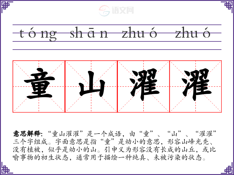 “童山濯濯”是一个成语,由“童”、“山”、“濯濯”三个字组成。字面意思是指“童”是幼小的意思,形容山峰光秃、没有植被,似乎是幼小的山。引申义为形容没有长成的山丘,或比喻事物的初生状态,通常用于描绘一种纯真、未被污染的状态。