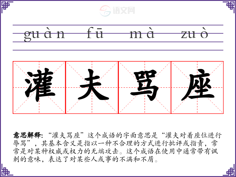 “灌夫骂座”这个成语的字面意思是“灌夫对着座位进行辱骂”,其基本含义是指以一种不合理的方式进行批评或指责,常常是对某种权威或权力的无端攻击。这个成语在使用中通常带有讽刺的意味,表达了对某些人或事的不满和不屑。