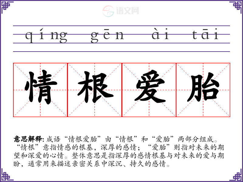 在英语中,可以用“deep affection”或“bond of love”来表达类似的情感,但并没有一个完全对应的成语来涵盖“情根爱胎”所包含的深厚感情与对未来的期待。这显示了文化之间在情感表达上的细微差别。