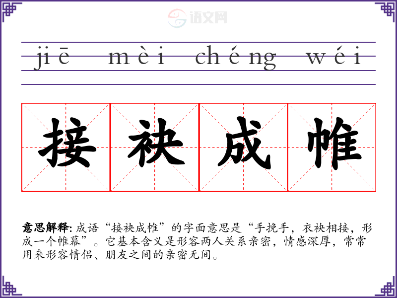 成语“接袂成帷”的字面意思是“手挽手,衣袂相接,形成一个帷幕”。它基本含义是形容两人关系亲密,情感深厚,常常用来形容情侣、朋友之间的亲密无间。