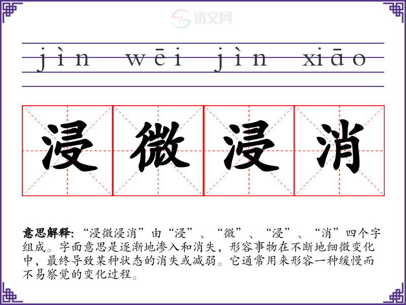 “浸微浸消”由“浸”、“微”、“浸”、“消”四个字组成。字面意思是逐渐地渗入和消失,形容事物在不断地细微变化中,最终导致某种状态的消失或减弱。它通常用来形容一种缓慢而不易察觉的变化过程。