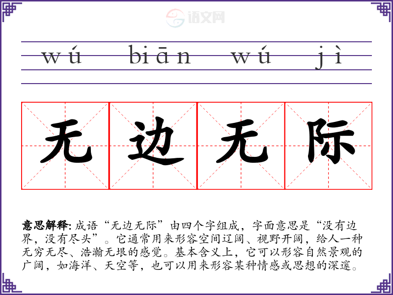 通过对“无边无际”的学,我意识到这一成语不仅在语言表达中具备丰富的表现力,也反映了人们对自然和生命的深刻思考。在语言学中,掌握这样的成语可以丰富我们的表达,增强沟通的深度和广度。