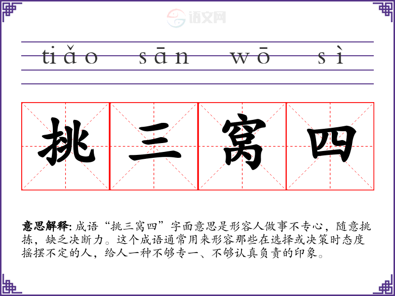 通过对“挑三窝四”的学,我认识到在语言学中,成语不仅是词汇的积累,更是文化和社会价值观的体现。这个成语提醒我在生活中要更加果断,不仅有助于提高决策能力,也能增强与他人的沟通效果。