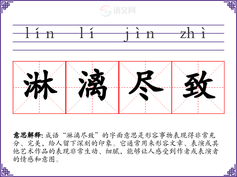 成语“淋漓尽致”的字面意思是形容事物表现得非常充分、完美,给人留下深刻的印象。它通常用来形容文章、表演或其他艺术作品的表现非常生动、细腻,能够让人感受到作者或表演者的情感和意图。