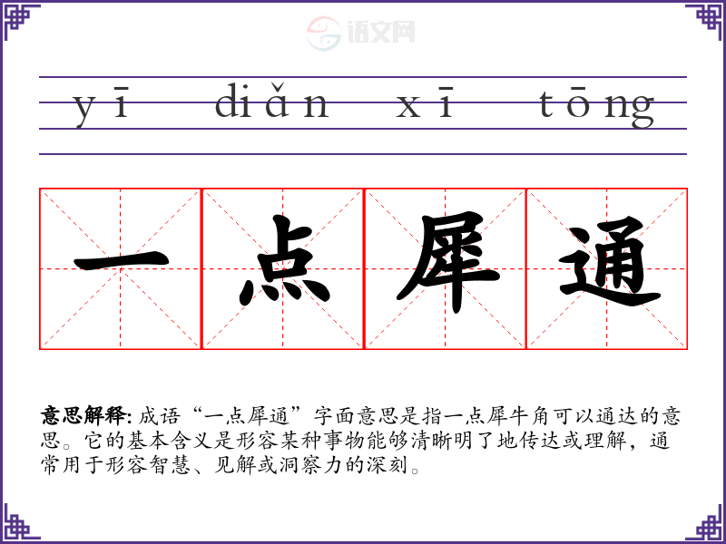 成语“一点犀通”字面意思是指一点犀牛角可以通达的意思。它的基本含义是形容某种事物能够清晰明了地传达或理解,通常用于形容智慧、见解或洞察力的深刻。