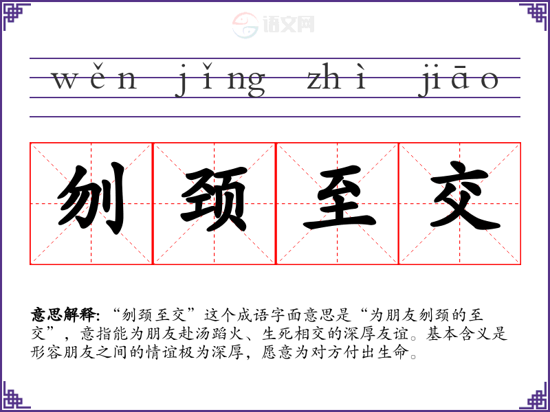 “刎颈至交”这个成语字面意思是“为朋友刎颈的至交”,意指能为朋友赴汤蹈火、生死相交的深厚友谊。基本含义是形容朋友之间的情谊极为深厚,愿意为对方付出生命。