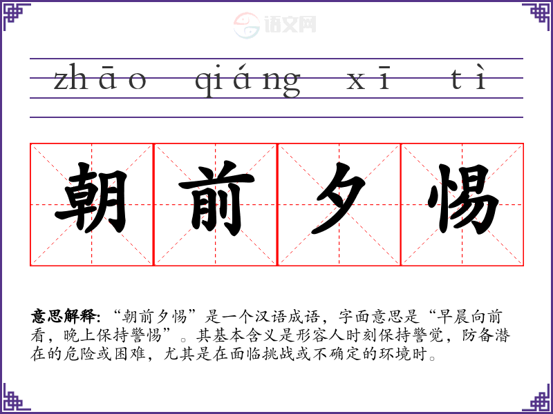 通过对“朝前夕惕”的学,我更加明白了保持警觉和谨慎的重要性。在语言学和表达中,这个成语提醒我在沟通时要注意细节和潜在的误解,从而提高我的表达能力和沟通效果。这个成语不仅是字面上的警觉,更是一种生活哲学。