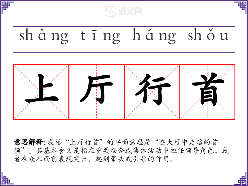 成语“上厅行首”的字面意思是“在大厅中走路的首领”。其基本含义是指在重要场合或集体活动中担任领导角色,或者在众人面前表现突出,起到带头或引导的作用。