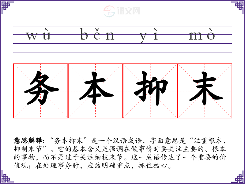 “务本抑末”是一个汉语成语,字面意思是“注重根本,抑制末节”。它的基本含义是强调在做事情时要关注主要的、根本的事物,而不是过于关注细枝末节。这一成语传达了一个重要的价值观:在处理事务时,应该明确重点,抓住核心。