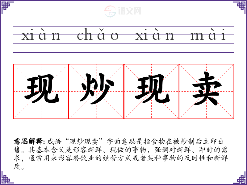 成语“现炒现卖”字面意思是指食物在被炒制后立即出售。其基本含义是形容新鲜、现做的事物,强调对新鲜、即时的需求,通常用来形容餐饮业的经营方式或者某种事物的及时性和新鲜度。