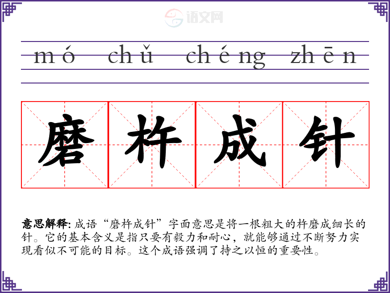 成语“磨杵成针”字面意思是将一根粗大的杵磨成细长的针。它的基本含义是指只要有毅力和耐心,就能够通过不断努力实现看似不可能的目标。这个成语强调了持之以恒的重要性。