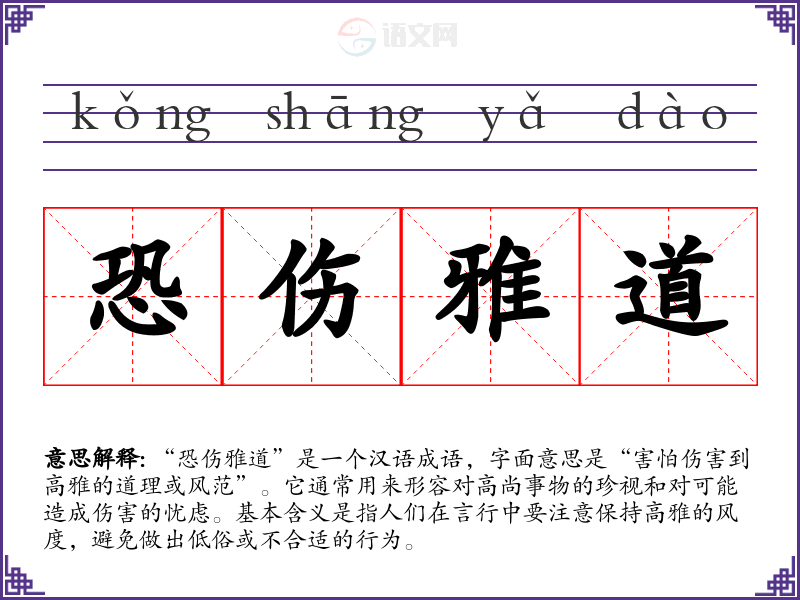 “恐伤雅道”可在多种语境中使用,包括文学作品、日常对话、演讲等。例如,在文学作品中,可以用来描述人物在某种情况下对高尚理想的坚持;在日常对话中,可能用于提醒他人注意自己的言行,以免给人留下不好的印象;在演讲中,可能用作对听众的劝诫,强调高雅追求的重要性。