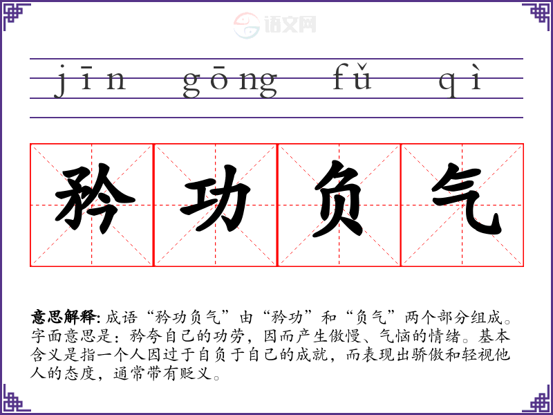 “矜功负气”并没有明确的历史典故,但其构成的字词在古代文献中常有出现。“矜”意为自夸或自负,“功”指成绩或成就;“负气”则是指因情绪失控而产生的怒气或不满。整体来看,这个成语反映了人们在成就面前的傲慢态度,往往与古代士人追求谦逊的价值观相悖。