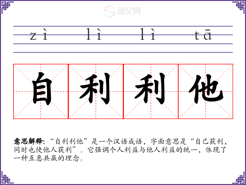 “自利利他”是一个汉语成语,字面意思是“自己获利,同时也使他人获利”。它强调个人利益与他人利益的统一,体现了一种互惠共赢的理念。