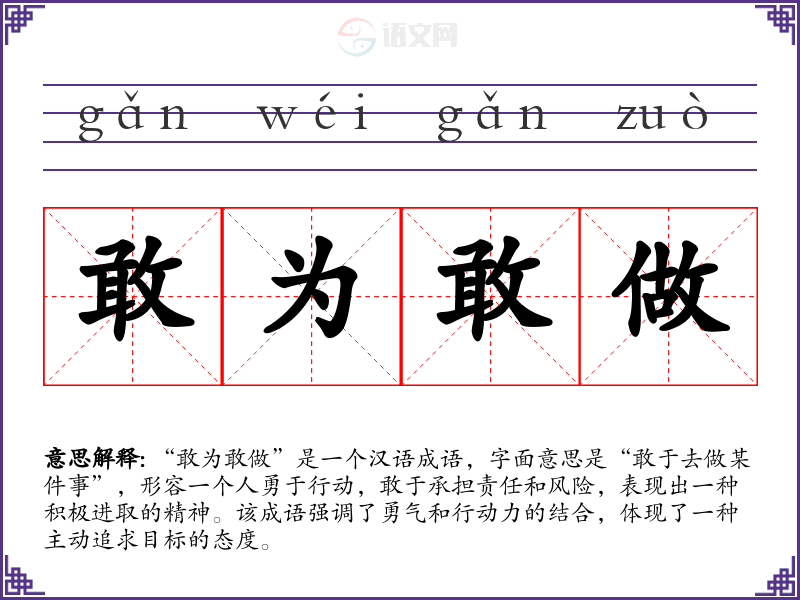 “敢为敢做”是一个汉语成语,字面意思是“敢于去做某件事”,形容一个人勇于行动,敢于承担责任和风险,表现出一种积极进取的精神。该成语强调了勇气和行动力的结合,体现了一种主动追求目标的态度。