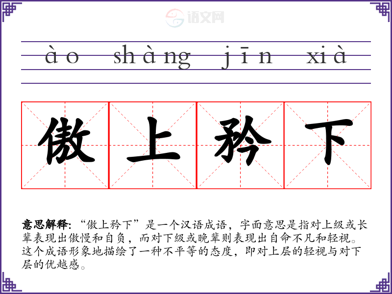 该成语通常用于批评那些对自己地位过于自信,傲慢无礼的人。它可以在文学作品中描写人物性格,也可以在日常对话中用来形容某些人的行为。例如,在职场中,有些人对上级表现得过于谦卑,而对同事则显得傲慢,这种行为就可以用“傲上矜下”来形容。