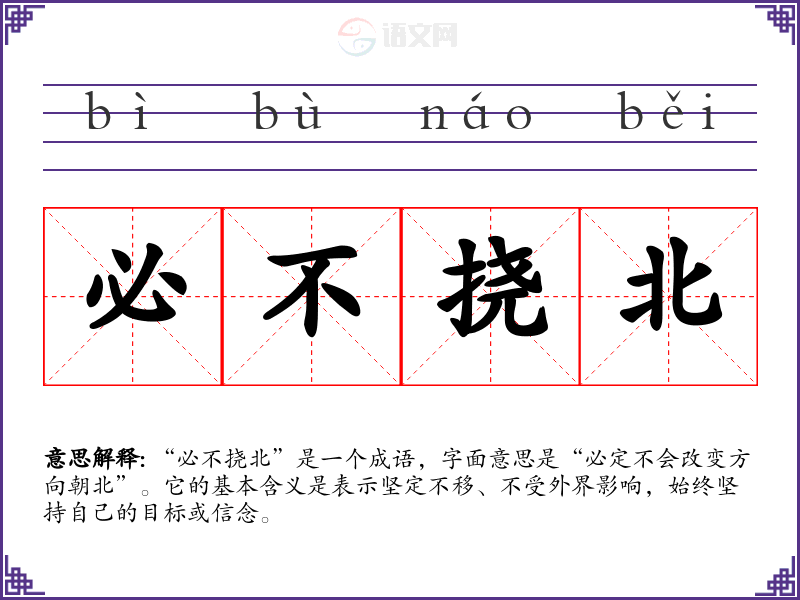 “必不挠北”是一个成语,字面意思是“必定不会改变方向朝北”。它的基本含义是表示坚定不移、不受外界影响,始终坚持自己的目标或信念。