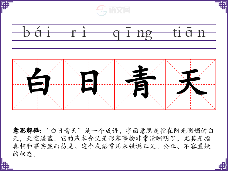 “白日青天”是一个成语,字面意思是指在阳光明媚的白天,天空湛蓝。它的基本含义是形容事物非常清晰明了,尤其是指真相和事实显而易见。这个成语常用来强调正义、公正、不容置疑的状态。