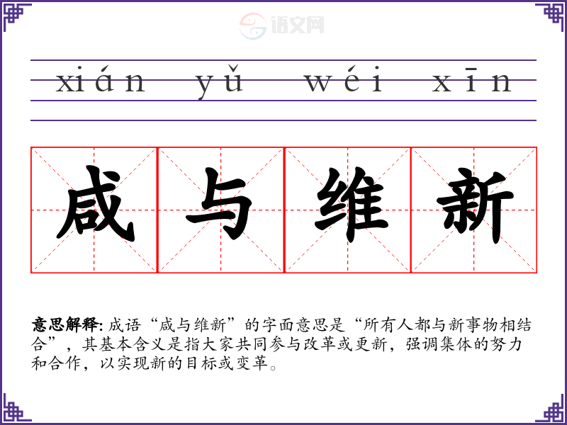 成语“咸与维新”的字面意思是“所有人都与新事物相结合”,其基本含义是指大家共同参与改革或更新,强调集体的努力和合作,以实现新的目标或变革。