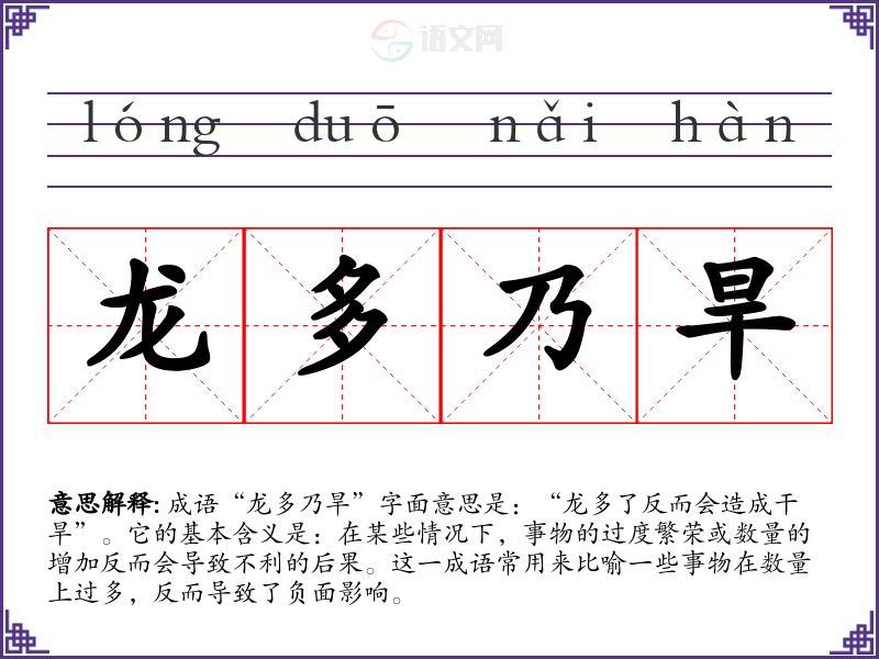 成语“龙多乃旱”字面意思是:“龙多了反而会造成干旱”。它的基本含义是:在某些情况下,事物的过度繁荣或数量的增加反而会导致不利的后果。这一成语常用来比喻一些事物在数量上过多,反而导致了负面影响。