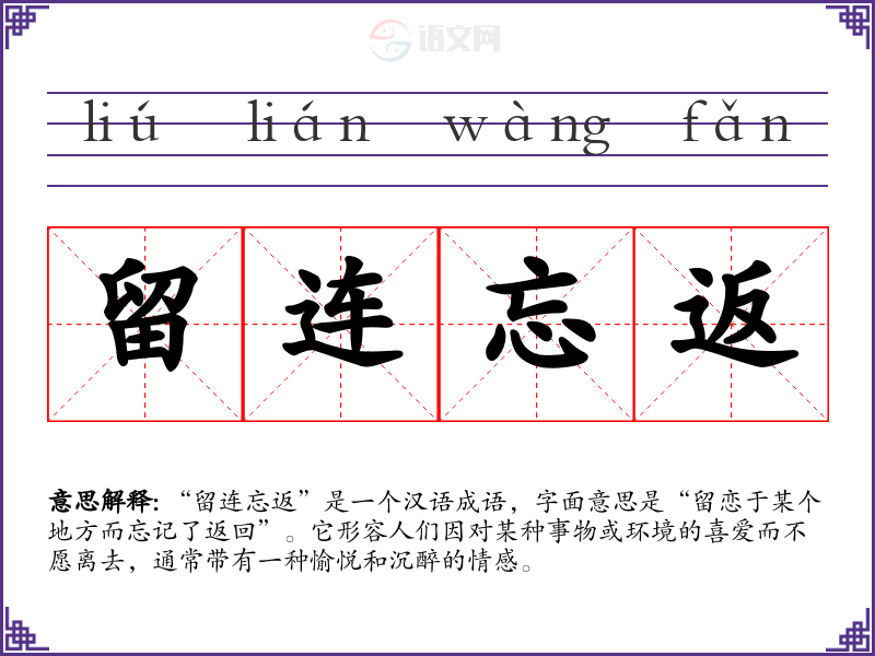 “留连忘返”是一个汉语成语,字面意思是“留恋于某个地方而忘记了返回”。它形容人们因对某种事物或环境的喜爱而不愿离去,通常带有一种愉悦和沉醉的情感。