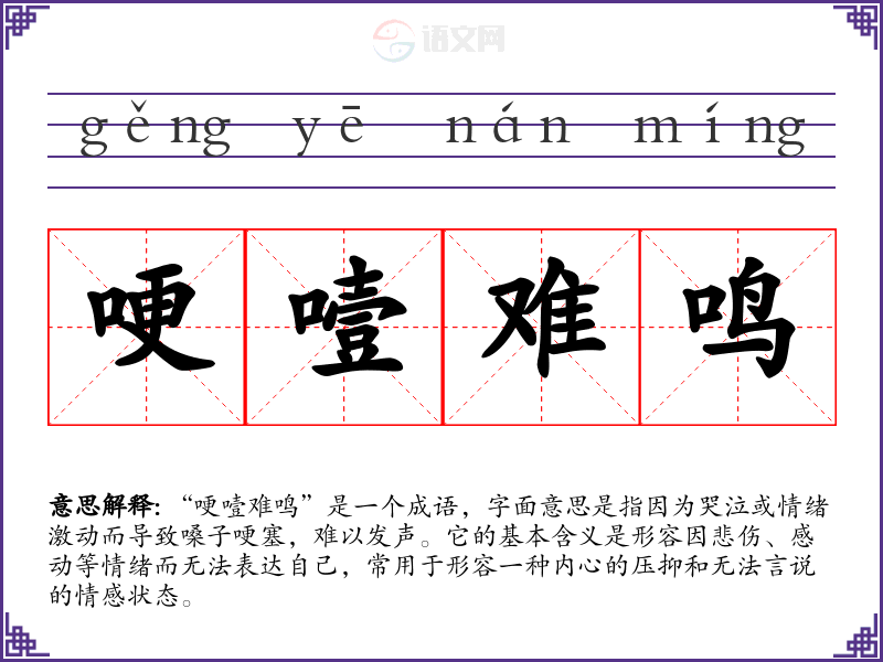 “哽噎难鸣”是一个成语,字面意思是指因为哭泣或情绪激动而导致嗓子哽塞,难以发声。它的基本含义是形容因悲伤、感动等情绪而无法表达自己,常用于形容一种内心的压抑和无法言说的情感状态。