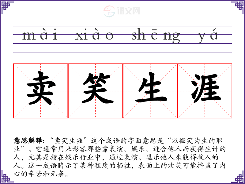 “卖笑生涯”这个成语的字面意思是“以微笑为生的职业”。它通常用来形容那些靠表演、娱乐、迎合他人而获得生计的人,尤其是指在娱乐行业中,通过表演、逗乐他人来获得收入的人。这一成语暗示了某种程度的牺牲,表面上的欢笑可能掩盖了内心的辛苦和无奈。