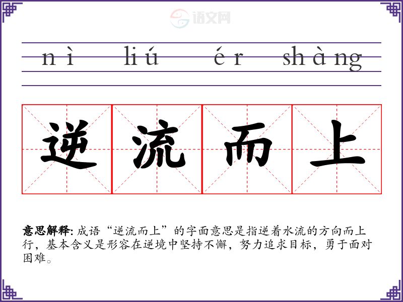 成语“逆流而上”的字面意思是指逆着水流的方向而上行,基本含义是形容在逆境中坚持不懈,努力追求目标,勇于面对困难。