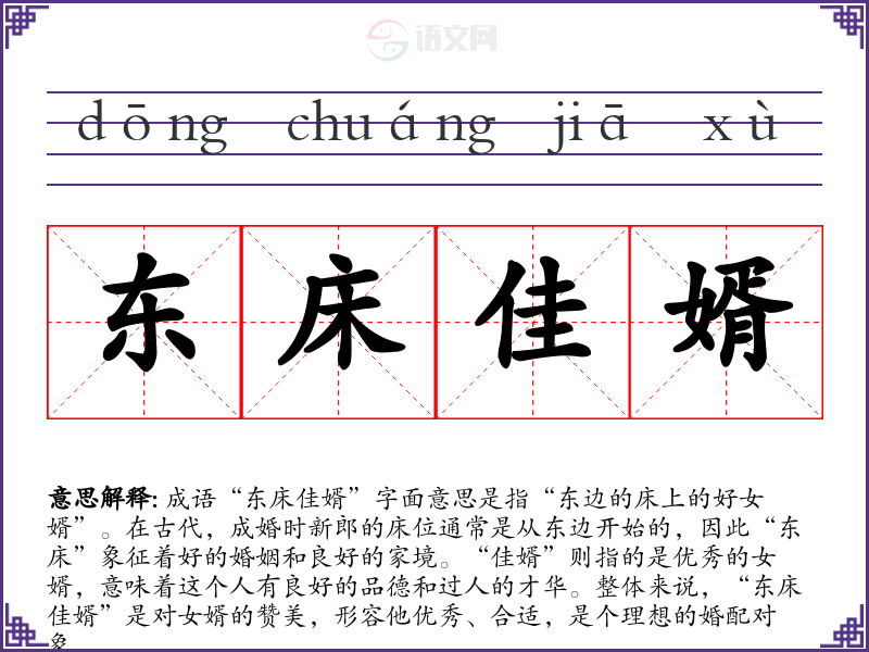 成语“东床佳婿”字面意思是指“东边的床上的好女婿”。在古代,成婚时新郎的床位通常是从东边开始的,因此“东床”象征着好的婚姻和良好的家境。“佳婿”则指的是优秀的女婿,意味着这个人有良好的品德和过人的才华。整体来说,“东床佳婿”是对女婿的赞美,形容他优秀、合适,是个理想的婚配对象。