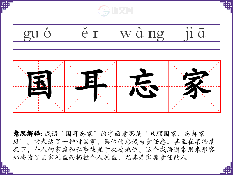 成语“国耳忘家”的字面意思是“只顾国家,忘却家庭”。它表达了一种对国家、集体的忠诚与责任感,甚至在某些情况下,个人的家庭和私事被置于次要地位。这个成语通常用来形容那些为了国家利益而牺牲个人利益,尤其是家庭责任的人。