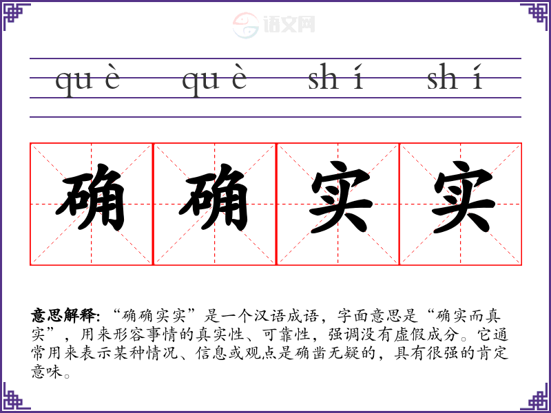 “确确实实”是一个汉语成语,字面意思是“确实而真实”,用来形容事情的真实性、可靠性,强调没有虚假成分。它通常用来表示某种情况、信息或观点是确凿无疑的,具有很强的肯定意味。