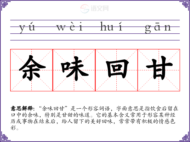 “余味回甘”让我联想到美好的回忆和深刻的体验,无论是一次难忘的旅行,还是一顿丰盛的晚餐。它传达出一种温暖和满足的感觉,促使我在表达时更加注意情感的细腻。