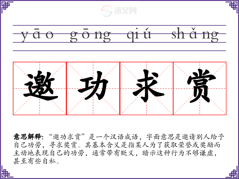 “邀功求赏”是一个汉语成语,字面意思是邀请别人给予自己功劳,寻求奖赏。其基本含义是指某人为了获取荣誉或奖励而主动地表现自己的功劳,通常带有贬义,暗示这种行为不够谦虚,甚至有些自私。