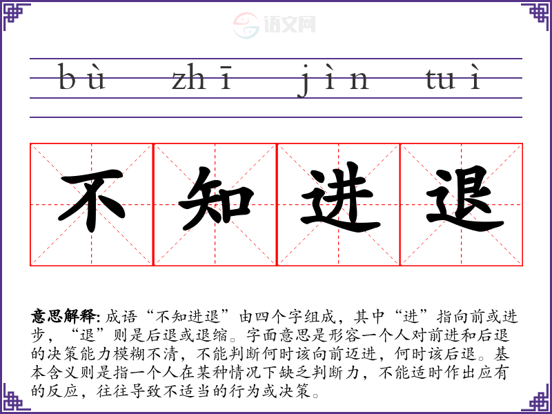 成语“不知进退”由四个字组成,其中“进”指向前或进步,“退”则是后退或退缩。字面意思是形容一个人对前进和后退的决策能力模糊不清,不能判断何时该向前迈进,何时该后退。基本含义则是指一个人在某种情况下缺乏判断力,不能适时作出应有的反应,往往导致不适当的行为或决策。