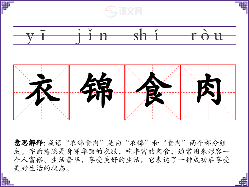 成语“衣锦食肉”是由“衣锦”和“食肉”两个部分组成。字面意思是身穿华丽的衣服,吃丰富的肉食,通常用来形容一个人富裕、生活奢华,享受美好的生活。它表达了一种成功后享受美好生活的状态。