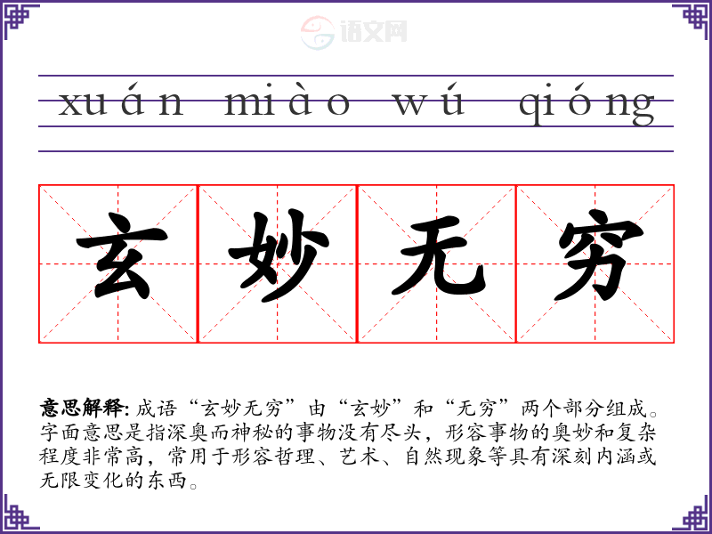 成语“玄妙无穷”由“玄妙”和“无穷”两个部分组成。字面意思是指深奥而神秘的事物没有尽头,形容事物的奥妙和复杂程度非常高,常用于形容哲理、艺术、自然现象等具有深刻内涵或无限变化的东西。