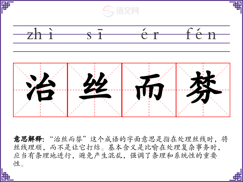 “治丝而棼”这个成语的字面意思是指在处理丝线时,将丝线理顺,而不是让它打结。基本含义是比喻在处理复杂事务时,应当有条理地进行,避免产生混乱,强调了条理和系统性的重要性。
