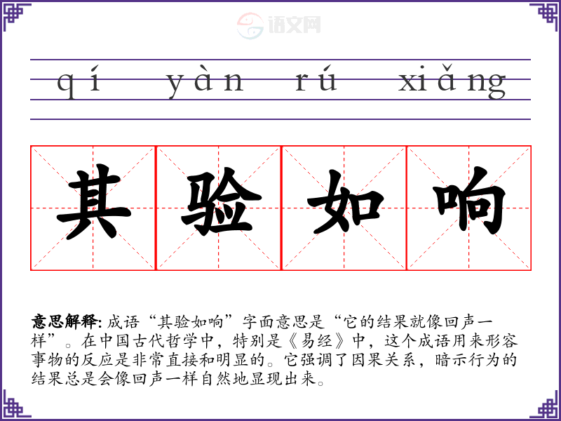 成语“其验如响”字面意思是“它的结果就像回声一样”。在**古代哲学中,特别是《易经》中,这个成语用来形容事物的反应是非常直接和明显的。它强调了因果关系,暗示行为的结果总是会像回声一样自然地显现出来。