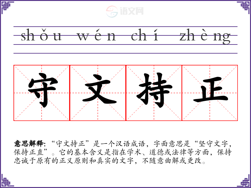 “守文持正”是一个汉语成语,字面意思是“坚守文字,保持正直”。它的基本含义是指在学术、道德或法律等方面,保持忠诚于原有的正义原则和真实的文字,不随意曲解或更改。