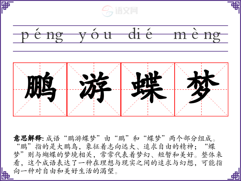 成语“鹏游蝶梦”由“鹏”和“蝶梦”两个部分组成。“鹏”指的是大鹏鸟,象征着志向远大、追求自由的精神;“蝶梦”则与蝴蝶的梦境相关,常常代表着梦幻、短暂和美好。整体来看,这个成语表达了一种在理想与现实之间的追求与幻想,可能指向一种对自由和美好生活的渴望。