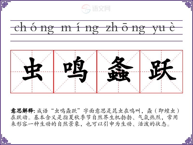 成语“虫鸣螽跃”字面意思是昆虫在鸣叫,螽(即蝗虫)在跃动。基本含义是指夏秋季节自然界生机勃勃、气氛热烈,常用来形容一种生动的自然景象,也可以引申为生动、活泼的状态。